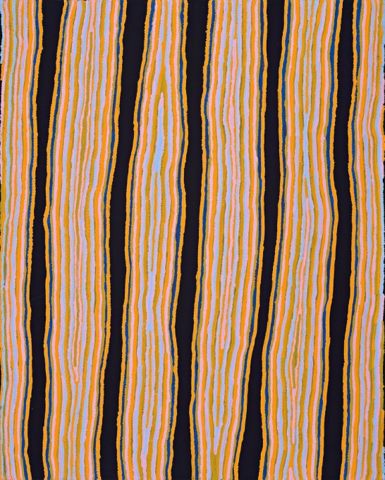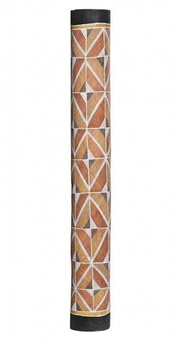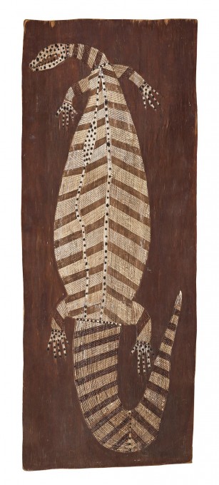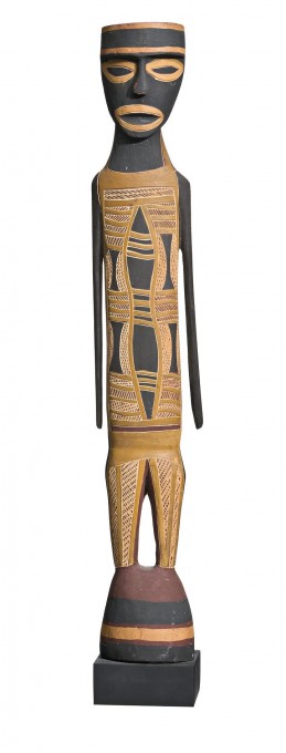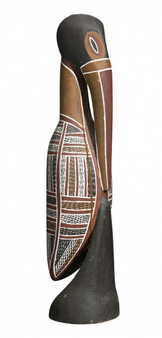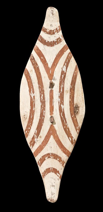 carved and incised hardwood, each with blade-like biconvex distal ends decorated with engraved designs on both sides, the shafts of circular section terminating in a bulbous pointed base. One blade is decorated with three figures, a lizard, an emu, and a swan, and on the other side a man throwing a spear, a kangaroo, and another figure. The second blade is decorated with engraved traditional motifs