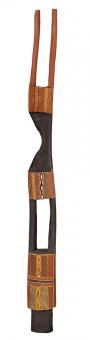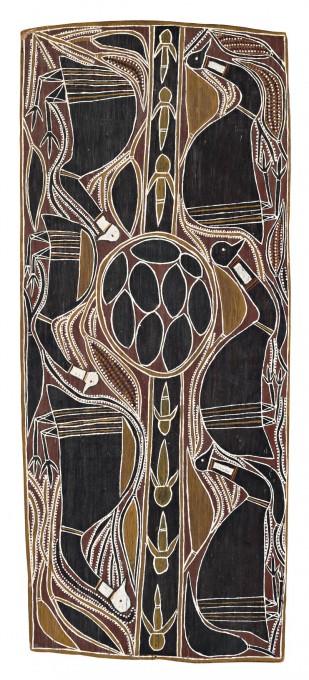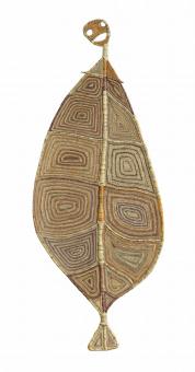originating from east Cape York, the group comprises three adult and one child's spearthrower, all of elongated leaf-like form, the wooden peg attached with fibre bindings and resin, the handle constructed from shaped bailer shell secured to end with resin, shell handle missing on the smaller example