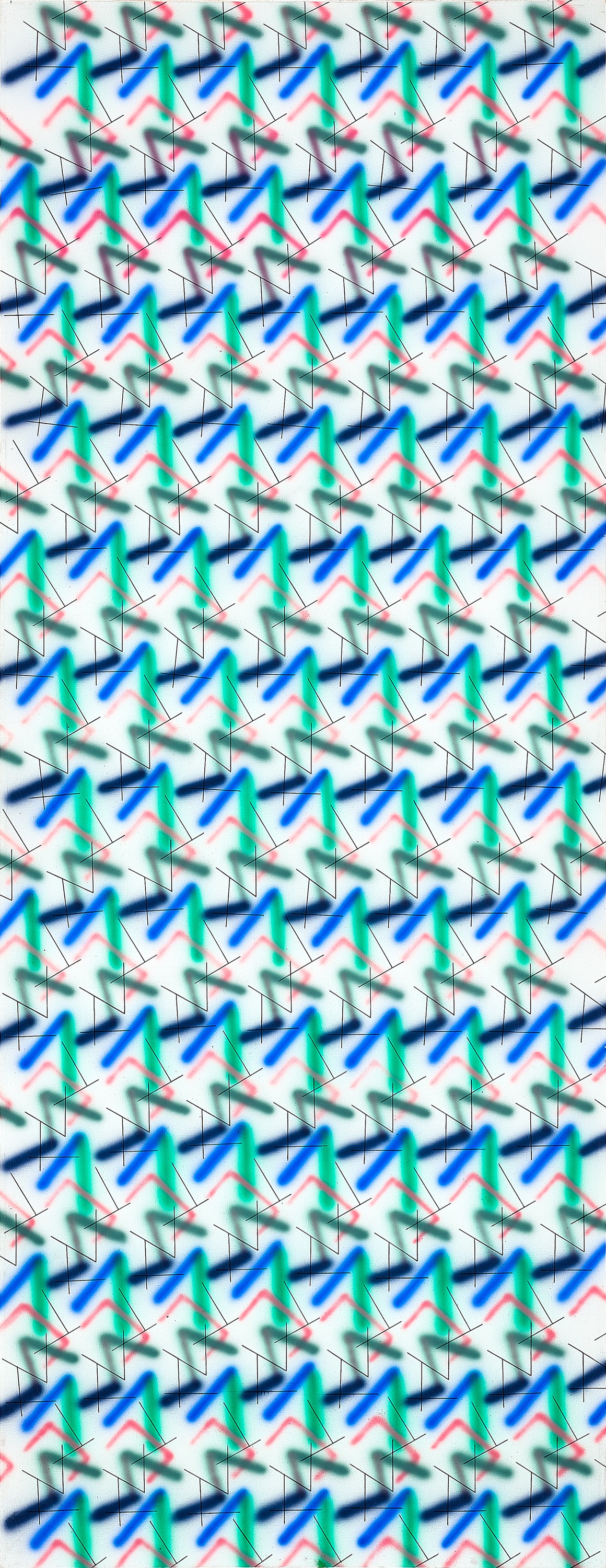Arrows and crosses, 1980 confidently continues Arkley’s challenge to the notion of ‘pure form’, interrupting the visual oscillations of Op Art with the artist’s assured airbrushed marks that seem to dance across the canvas.4 At once effortlessly precise and playful, the work’s complex design involves a combination of coloured sprayed elements with a repeated overall pattern of arrows and crosses in fine black line. With his first wife, artist Elizabeth Gower (from whom he separated in 1979) Arkley shared an interest in the way in which patternmaking could interrupt, complicate and converse with abstraction, thus also incorporating ideas drawn from craft and feminism into his abstract compositions. Such diverse sources are evident in the tram that Arkley was commissioned to paint by the Victorian Ministry for the Arts in the same year that Arrows and crosses was made. With its white background and all-over pattern of red, blue, black and grey circles, the tram’s makeover (or ‘gloss up’ in today’s jargon) was inspired by both embroidery and the fuzzy-edged circles of dot matrix printing.5 One can imagine that Arkley would have loved broadcaster Phillip Adams’ description of these ‘new’ Melbourne trams as ‘mobile murals’ and ‘electric frescoes’6 and the capacity of the tram to enable his art to participate and function in everyday life.
