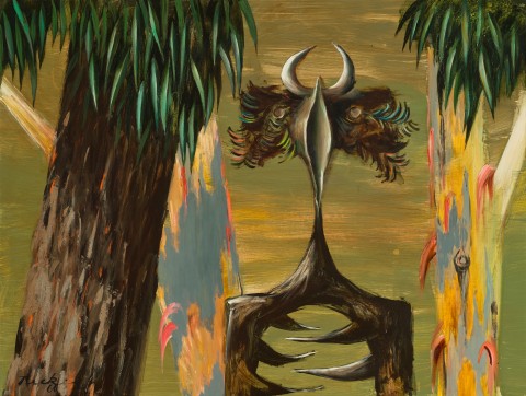 Following the influence of artists such as Picasso, Tucker had a lifelong interest in non-Western art and he began collecting sculptures and masks in Melbourne in the 1940s, later travelling to New Guinea to experience the Sepik River region firsthand and further expand his collection. Like the early French modernists, ‘primitive’ art served as a liberating force in Tucker’s practice, helping to free him from the inherited constraints of the Western tradition and open his practice to the power and possibilities of myth. The potent combination of Surrealism, the poetry of T.S. Eliot and contemporary discussion of Jung’s archetypes, served as a platform for discovery and experimentation in his work from as early as the 1940s and the creation of his now iconic series Images of Modern Evil, 1943 – 48. From the grinning faces of the women in a painting such as Victory girls, 1943 (National Gallery of Australia) and the triangular gaping mouth of the figure in Memory of Leonski, 1943 (National Gallery of Victoria), the mouth motif thus transformed into the shape of a crescent, serving as a kind of visual shorthand for the artist:
