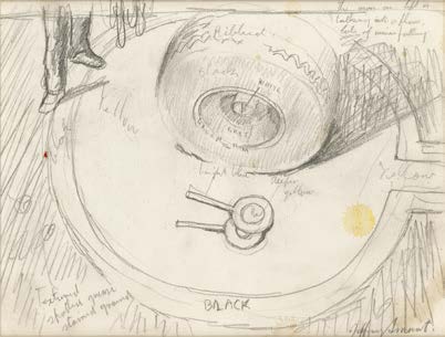The initial sketch, offered alongside Night stop, Bombay, reveals the rapid crystallisation of the motif, ‘becoming, more or less, without much alteration, the finished work’.4 Annotated with colour notes and areas of interest requiring greater detail, and a single splotch of yellow watercolour in the centre of the circle, the full composition is almost entirely present in this first sketch. The only slight revisions developed in the final painting were in the placement of the wheel, the direction of the sole straight line painted on the tarmac, and the expansion of the figure from just a pair of legs to a full body. Jeffrey Smart also created two detail drawings for Night stop, Bombay. Both addressed the aircraft wheel, on which Smart lavished special, hyper realistic attention, creating from it a visual synecdoche for air travel.