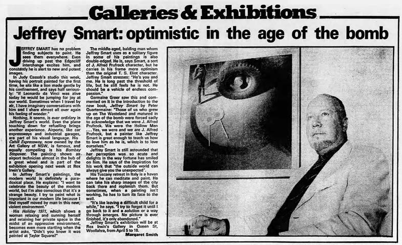 Smith, M., ‘Jeffrey Smart: optimistic in the age of the bomb’, The Sydney Morning Herald, Sydney, 1 April 1983, p. 24 (illus.)