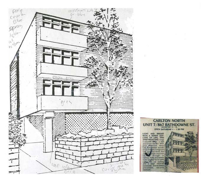 Like many of Arkley’s suburban exteriors, O.Y.O. Flats was inspired by a real estate advertisement for the sale of a ‘LIGHT AND BRIGHT’ apartment with a ‘SUNNY OUTLOOK ON LIFE’ in Rathdowne Street, North Carlton. Using the advertisement’s fine line drawing as the starting point of his painting, Arkley transposed the composition’s tight framing and somewhat lurching perspective, as well as the viewer’s vantage point from the street – filling the open white spaces of the apartment’s original ‘likeness’ with shimmering terracotta brickwork, a tessellated fence of alternating pastel hues, and large blocks of strong colour that emphasise the building’s blocky modernist form. The artist’s command of the airbrush really comes into play here, with the work’s confident black linework emphasising the block’s solidity and ‘good bones’ (to steal a real estate term), while proudly emphasising the painting’s undeniable Pop sensibility. As Arkley happily admitted, he was ‘never ever going to be a de Kooning or a John Olsen’ and he ‘was never going to love paint and wallow around in it’9: