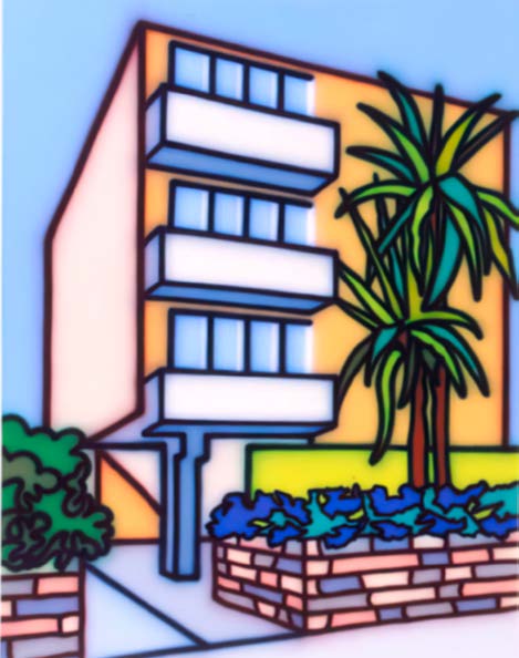 Like Andy Warhol before him, Arkley was not averse to reusing and repurposing his own imagery. The apartment block of O.Y.O. Flats may stand alone amongst the artist’s California bungalows, Spanish villas and triple-fronted brick veneer houses, but it continued to intrigue and ‘work on’ Arkley, who created two further versions: Modern O.Y.O. Flats, 1988 (with an altered perspective, different plants and a more muted palette) and Urban Apartments, 1999 (again, with altered perspective, and the replacement of the original gum with a palm tree11). It is fair to assume that the easy correspondence that O.Y.O. Flats establishes between Arkley and Warhol also resonated with the painting’s first owner, Henry Gillespie who met Warhol at a party in Los Angeles in the 1980s, later becoming the Australian editor of Warhol’s Interview magazine. He is one of only two Australians to have been painted by the artist (the other is Loti Smorgon AO) and was given one of the four portraits Warhol made of him in 1985 as payment for his work on the magazine.12 It is fitting to imagine O.Y.O. Flats in this company.