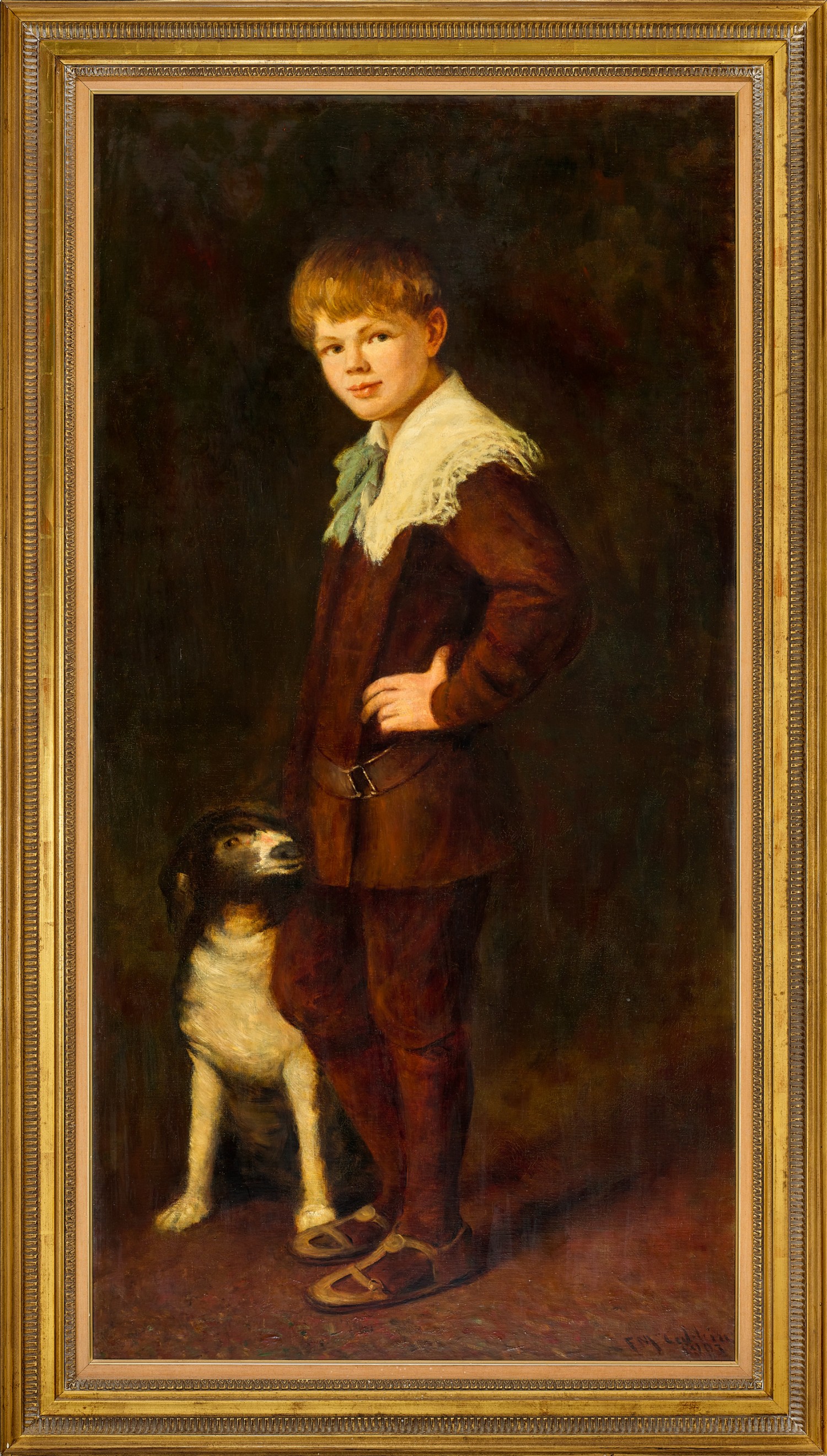 One of the artist’s fondest models was his fifth child, John ‘Sydney’ McCubbin (1896 – 1954) – known affectionately as ‘Ginger’ and immortalised in the superb portrait on offer here. Born on 13 June 1896 in Brighton, Victoria, Sydney thus features in some of his father’s most iconic works, including Lost, 1907 (National Gallery of Victoria) in which – aged about ten years old – he is portrayed alone and vulnerable in the harsh Australian bushland. His youngest sister, Kathleen, later recalled that the work was painted early in the morning and captured the environment surrounding their family property at Mount Macedon, ‘Fontainebleu’.1 Sydney was also the model for the infant in On the wallaby track, 1896 (Art Gallery of New South Wales), and likewise appears in Boy flying a kite, 1909 (private collection) as well as A frosty morning (also known as Winter morning), 1910, held in the Ewing Collection at the University of Melbourne.