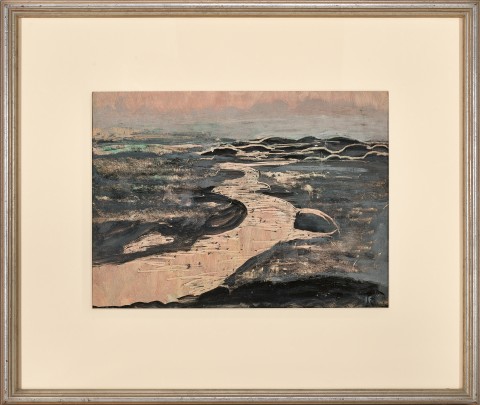 A compelling example from this period, The river, c.1954 was most likely inspired by the artist’s recollections of Huzhou, in the Yangtze River delta north of Hangzhou. As was his custom, Fairweather sent the painting to Macquarie Galleries devoid of notes, leaving the choice of title to be assigned by the gallery’s directors when it was exhibited in the annual Show of Sixes in 1956. Though abstracted in part, the composition retains an overall connection to landscape representation with its pale, winding river moving sinuously through a network of loosely drawn mountains and amorphous forms, evoking not one specific place but arguably, a composite memory of several —Huzhou, Suzhou, and possibly even Queensland. Thus, fusing memory, place and spiritual inquiry, indeed such paintings from this period unfold over the support’s surface like a stream of consciousness or ‘way of meditation’6 – betraying distant impressions of Chinese calligraphy, Aboriginal rock painting, and European Post-Impressionism.