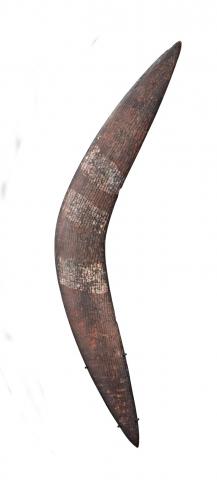carved hardwood with shiny patina, raised central horizontal and vertical ridges across arrow shaped head with extensive fibre wrapping on shaft, crescent shaped handle
